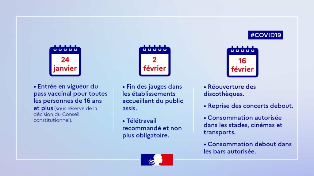 Dans son allocution du 20 janvier dernier, le Gouvernement a détaillé un calendrier d’allégement des mesures sanitaires que vous trouvez ci-dessous.