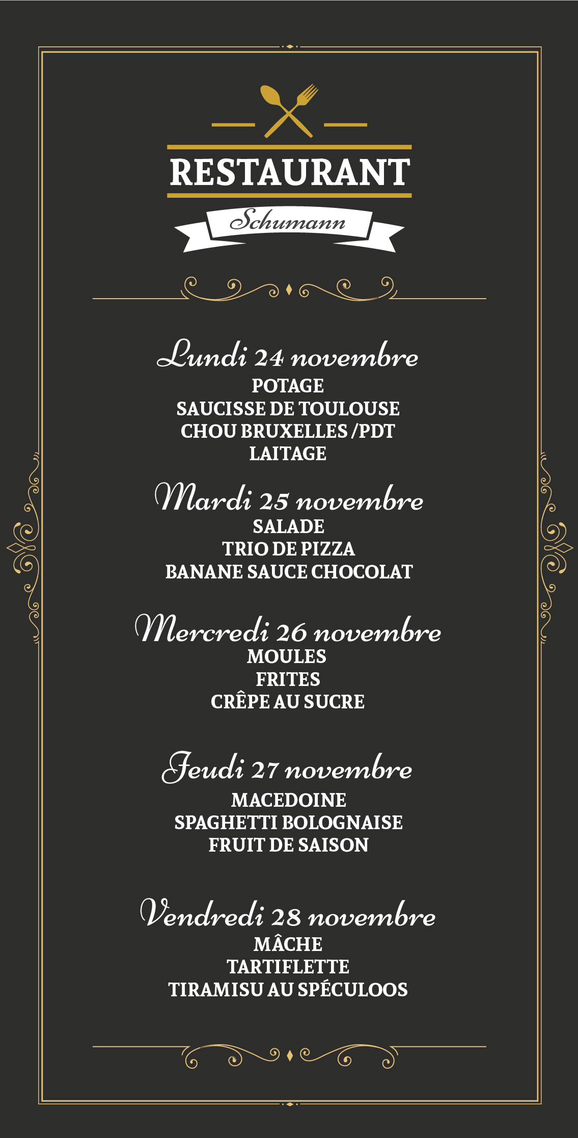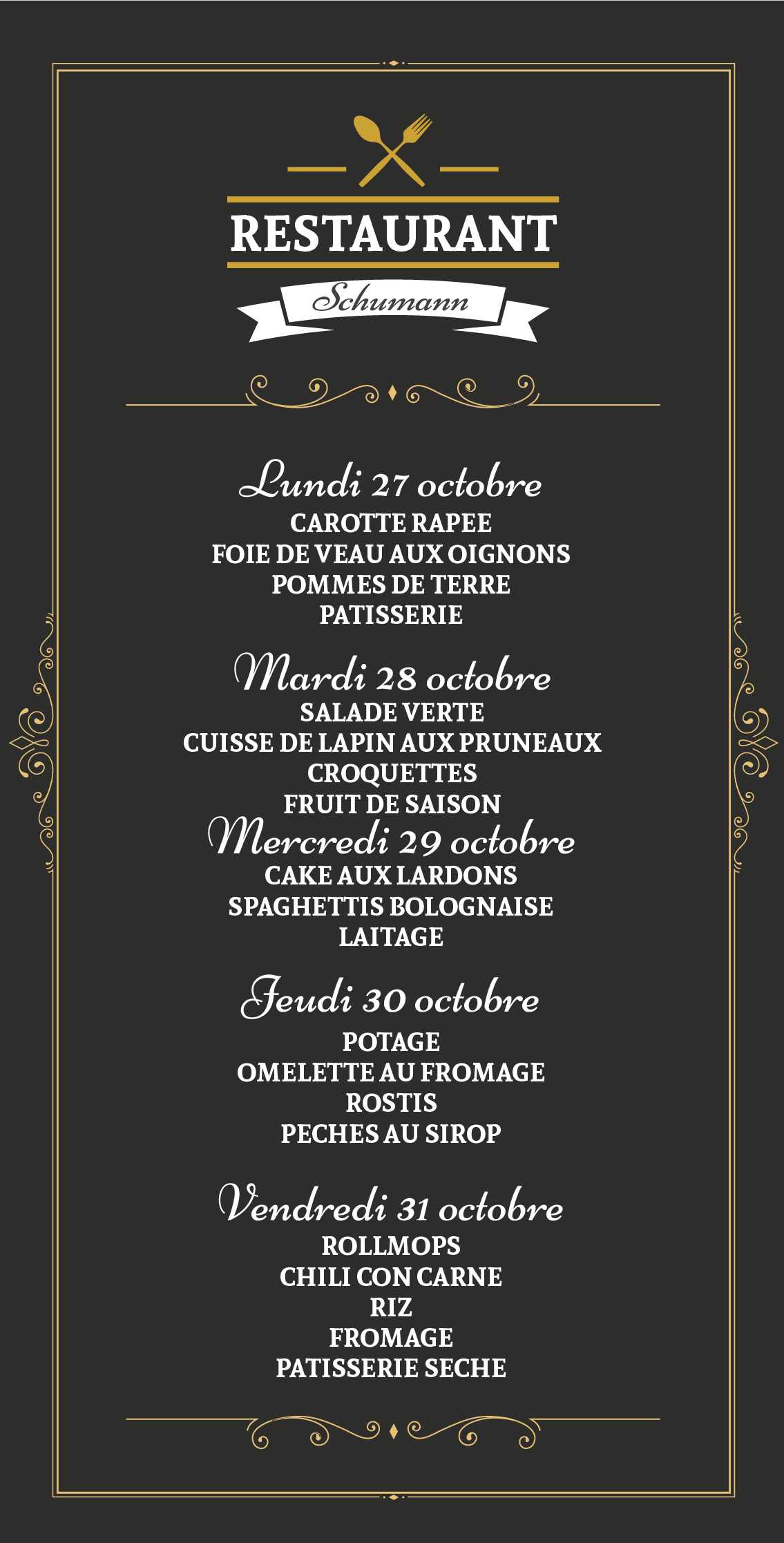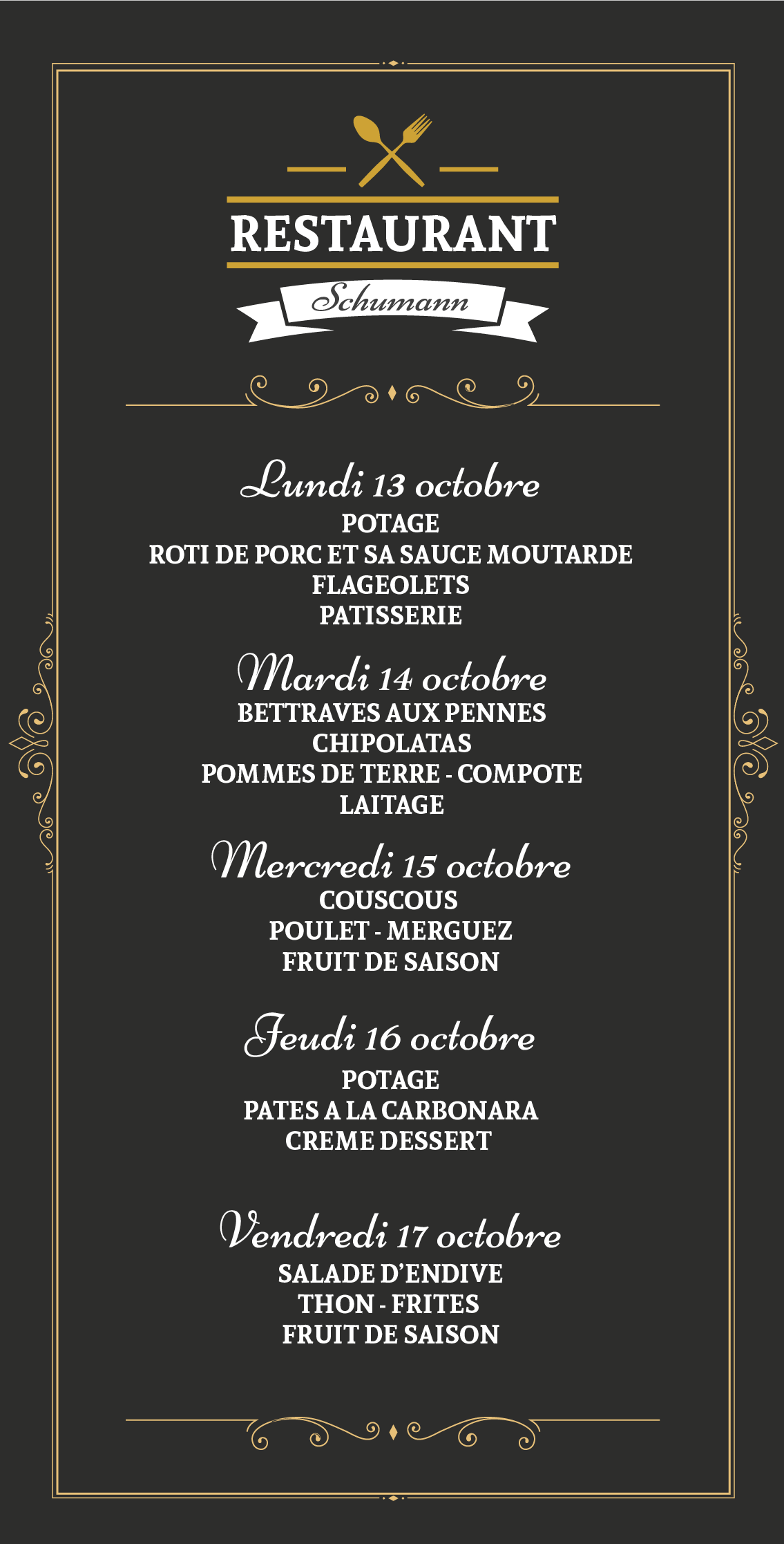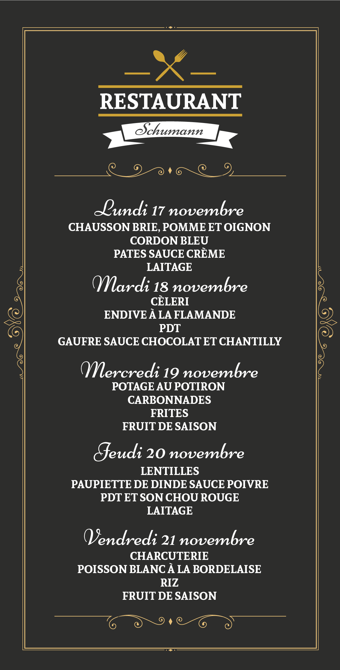 Réservations : la prise de réservations au restaurant Schumann se fait du lundi au jeudi 15 jours avant et pour les 15 jours suivants, par exemple les inscriptions prises le jeudi 19 octobre se font pour les repas des semaines du 30 octobre au 10 novembre.